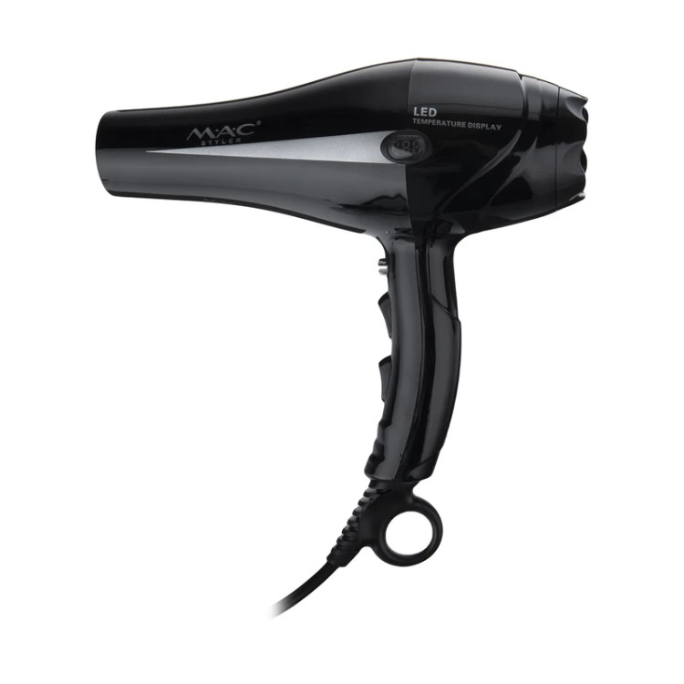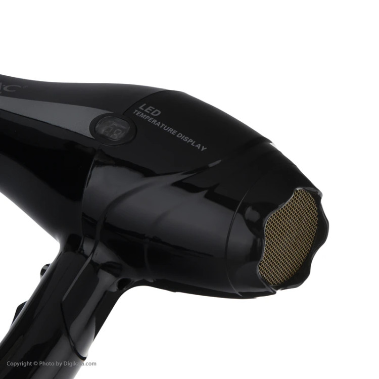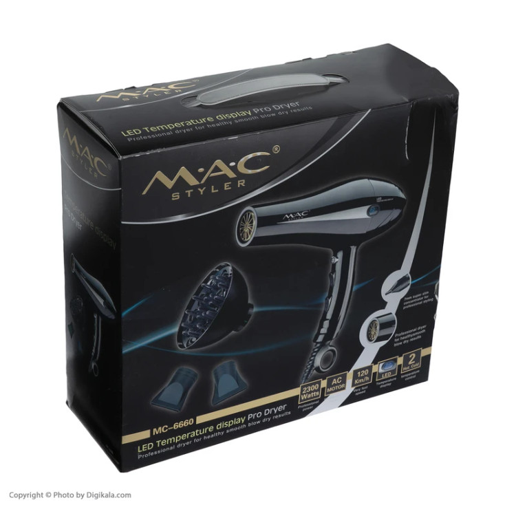 سشوار حرفهای مک استایلر مدل MC-6660، موتور AC با توان مصرفی 2200 وات، دارای فناوری تولید یون، دارای طراحی ارگونومیک، حلقه آویختن، نشانگر LED، وزن 725 گرم، تنظیم حرارت 3 حالته و کنترل سرعت 2 حالته، به همراه دیسپانسر و 2 عدد سری متمرکزکننده